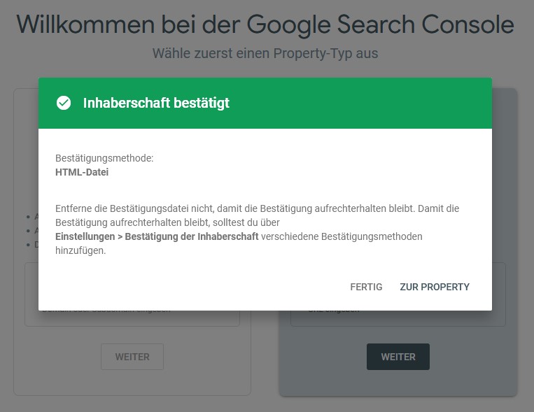 Man lädt dann eine generierte HTML Datei, zum Verifizieren von Google, in das angegebene Verzeichnis und bestätigt somit der Inhaber der Seite zu sein ("Website Property"):