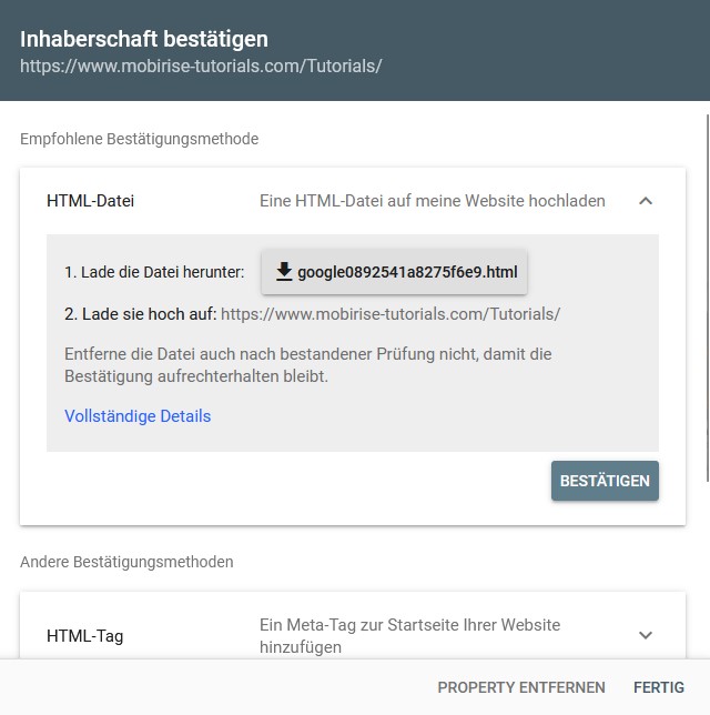 Man lädt dann eine generierte HTML Datei, zum Verifizieren von Google, in das angegebene Verzeichnis und bestätigt somit der Inhaber der Seite zu sein ("Website Property"):