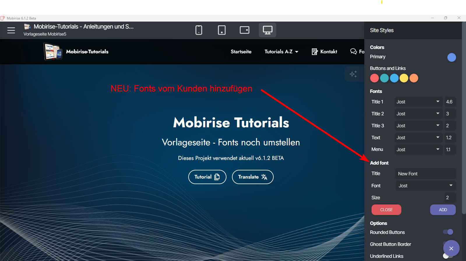 > Man kann nun erneut zusätzliche lokale Fonts am Button "Add Font" in den globalen Style-Einstellungen verwenden, denn diese Option aus v6.1.2 BETA wurde in der freigegebenen (released) Version 6.1.4 entfernt.