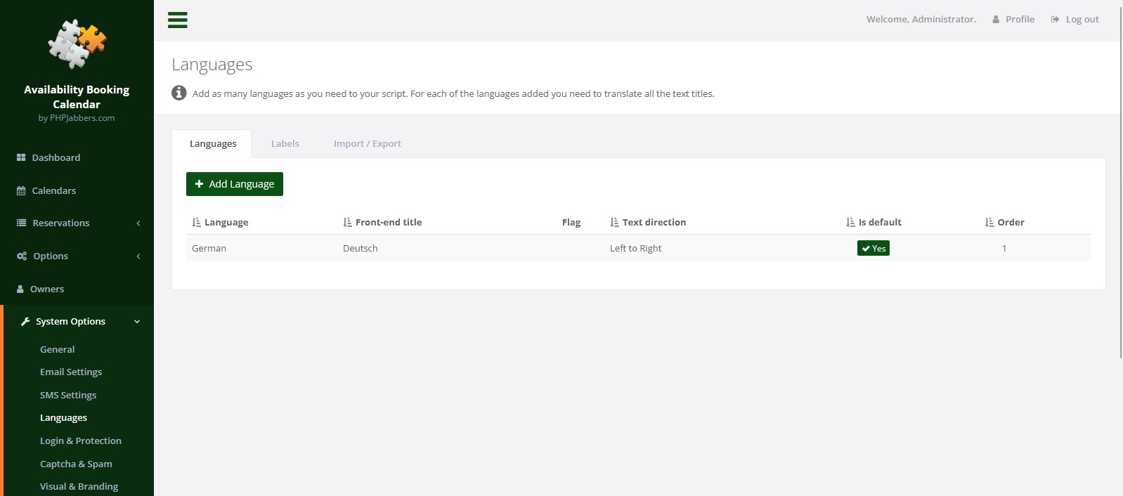 Übersetzung > Tab "Labels":