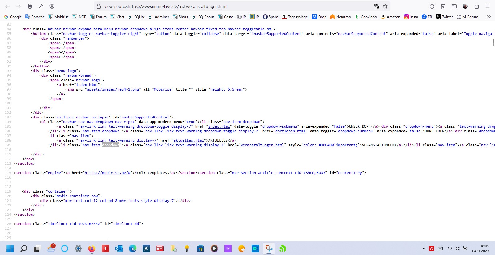 Suche dort im Inhalt nach "Veranstaltungen" und dort solltest Du dann auch die class="dropdown" am <li> Tag finden
