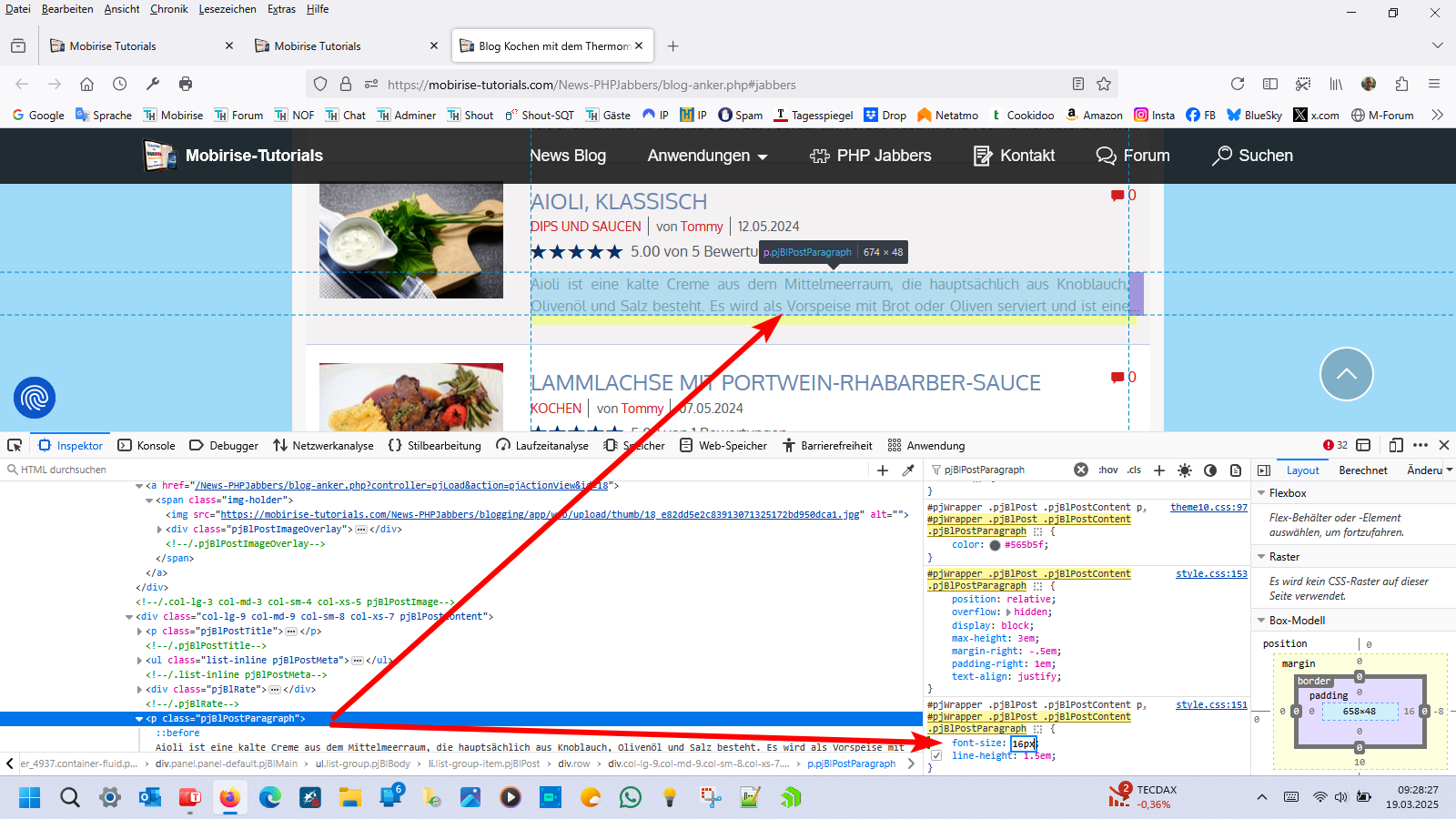 Dort sieht man dann z.B. bei mir die <p class="pjBlPostParagraph">. Du müsstest dann eben im "CSS Editor" von Mobirise diese Class ansprechen und ändern, wie z.B. die Font-Size von 14px in 16px: