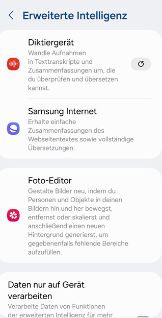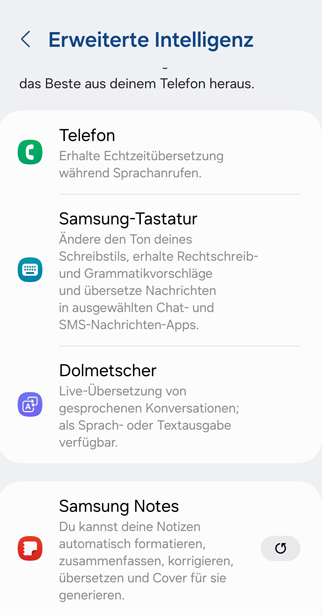 Hatte eben ein Update auf die neueste Software "One UI Version 6.1" für mein Android-Handy von Samsung. Auch dort haben sie jetzt jede Menge KI eingebaut. Siehe Screenshots.