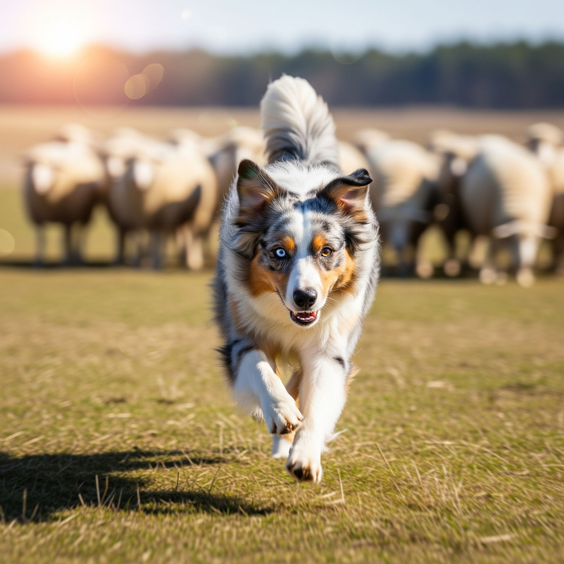 Bitte erstelle ein quadratisches Action-Foto. Ein Blue Merle Australian Shepherd mit leuchtenden Augen rennt in voller Geschwindigkeit am Betrachter vorbei. Starke Bewegungsunschärfe (Panning-Effekt), um die hohe Geschwindigkeit zu betonen. Der Hund ist scharf fokussiert. Im Hintergrund eine sonnige Wiese mit einer unscharfen Schafherde im Bokeh-Stil. Dynamisch, energetisch.