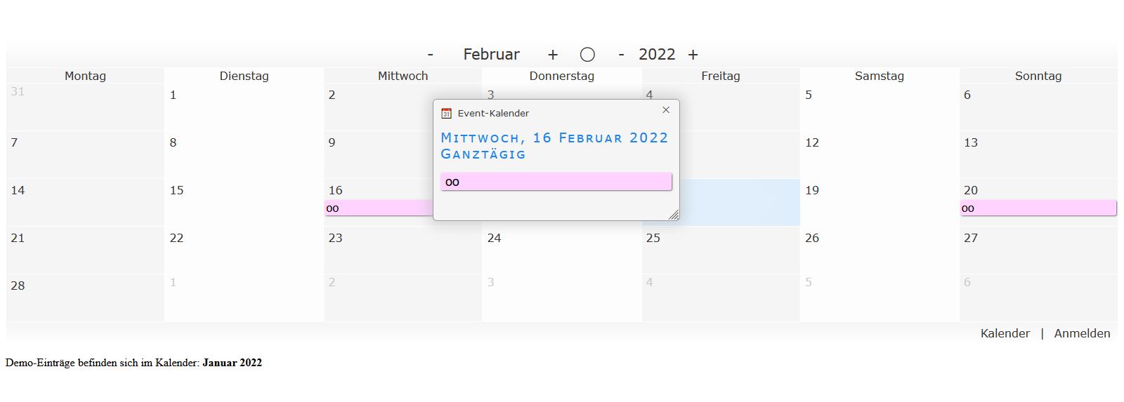 Du hast da so ulkige "oo" Einträge im Januar und Februar in Deinem Beispiel-Kalender - hast Du da was vergessen zu entfernen ...