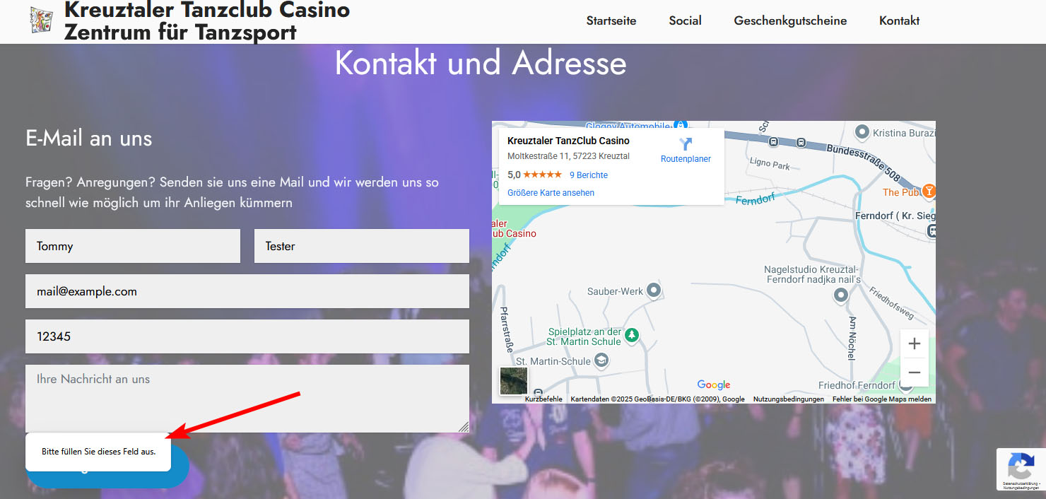 Dort sind sämtliche Felder auf "required" - also auf "erforderlich" - gestellt. Im Screenshot habe ich das auch nochmals getestet und das Feld "Nachrichten" leer gelassen. Das Formular kann dann nicht gesendet werden: