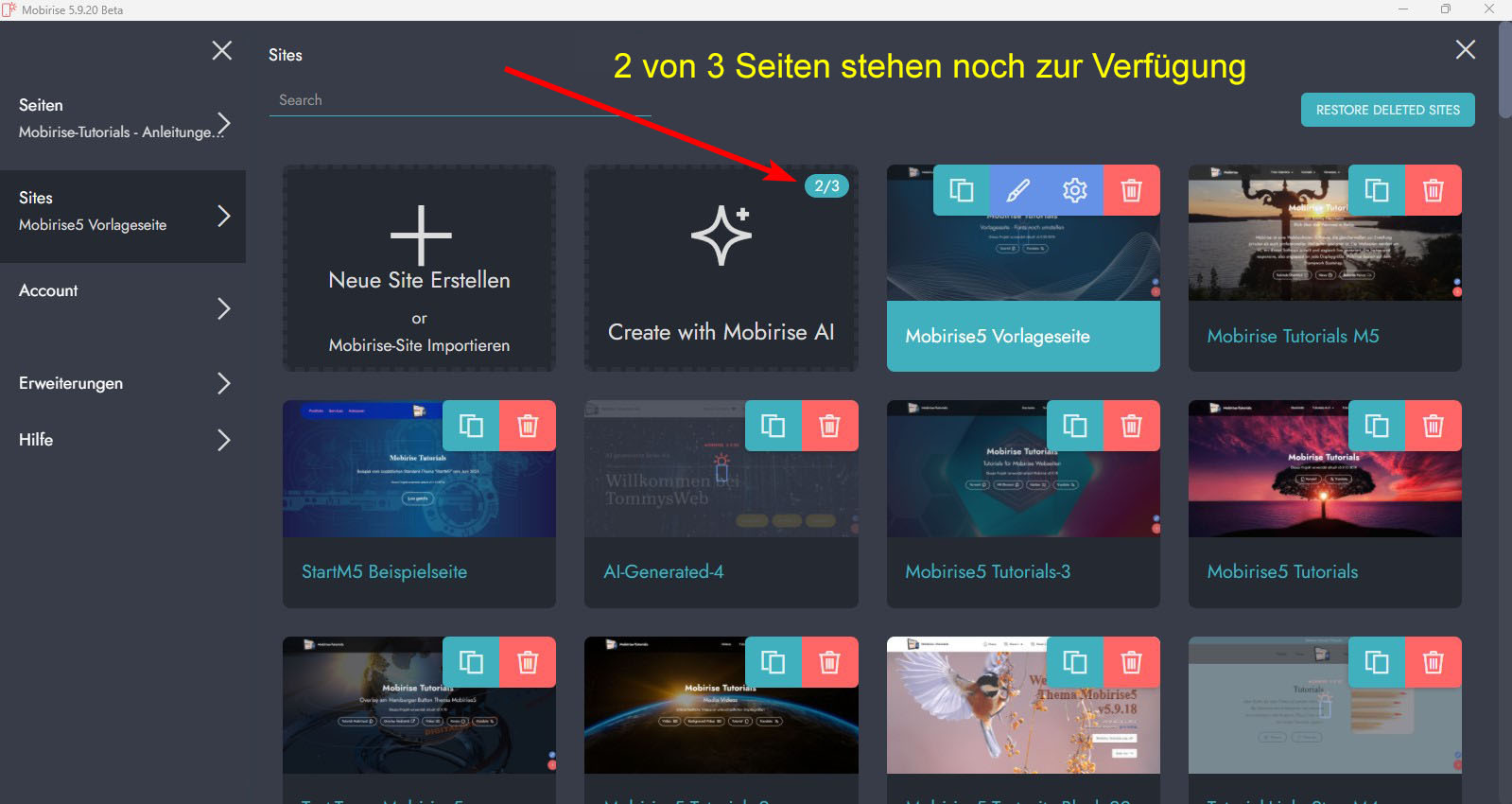 Bei mir wurde bereits eine der drei möglichen AI-Seiten als verbraucht gezählt, obwohl ich diese ausschließlich zu Testzwecken im Interesse von Mobirise erstellt habe: