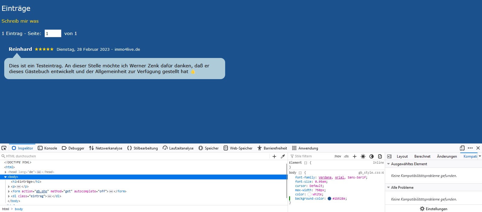 Dazu öffnest Du die CSS-Datei "style.css" vom Gästebuch und schreibst dort am Selektor "body" noch Deine Hintergrundfarbe dazu als: