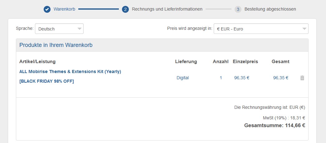 Ansonsten würde ich wohl auf das nächste Angebot zum "Black Friday Sale" warten, das bisher immer USD 95,00 gekostet hat. Black-Friday ist immer Ende November. Ich weiß natürlich nicht, ob Mobirise dieses Jahr alle Preise weiter stabil halten kann und wird. Auf jeden Fall ist der Euro im Kurs zum Dollar recht kräftig gefallen.