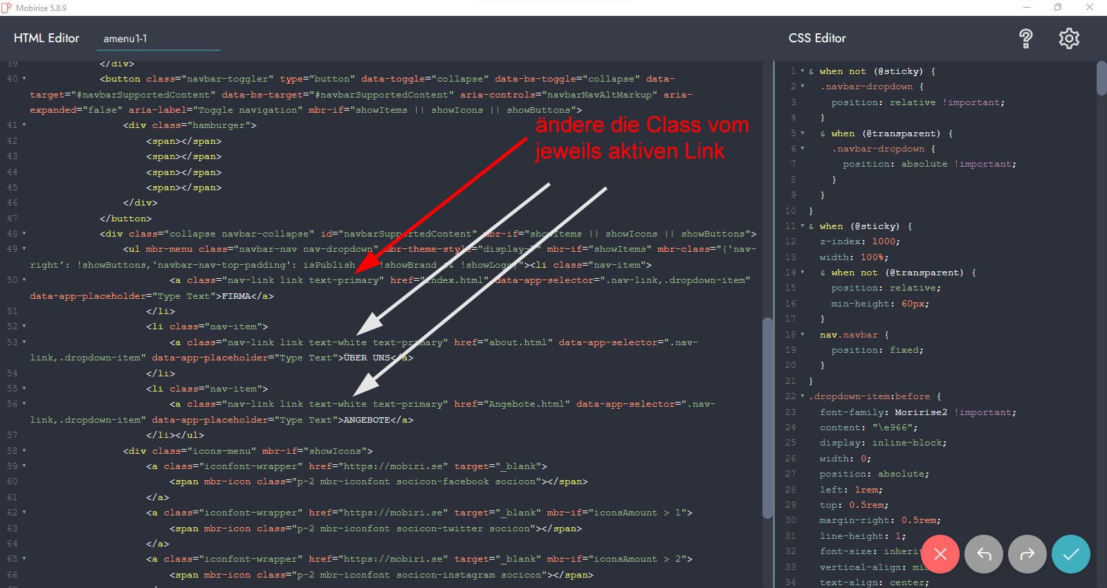 Mobirise müsste im Grunde mal eine Navi konstruieren, die (wie bei NOF früher) eben den jeweils zur aktiven Seite gehörenden Link mit einer class="active" bestückt.