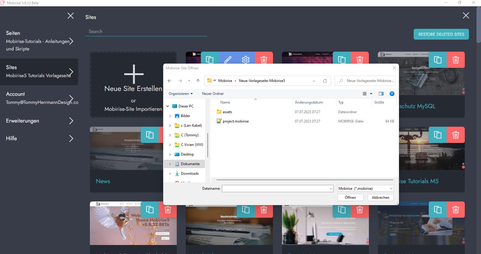 > dann die Projekt-Datei "project.mobirise" wählen. Im gleichen Verzeichnis muss sich der Ordner "assets" befinden