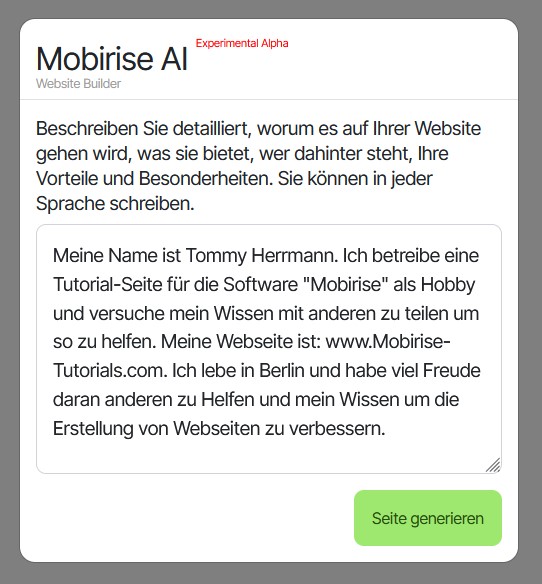 Diesen Text habe ich beim Mobirise AI Generator als einzige Info für die KI eingegeben und damit wurde meine Seite, so wie sie sich jetzt darstellt, in wenigen Sekunden generiert (kaum zu glauben):