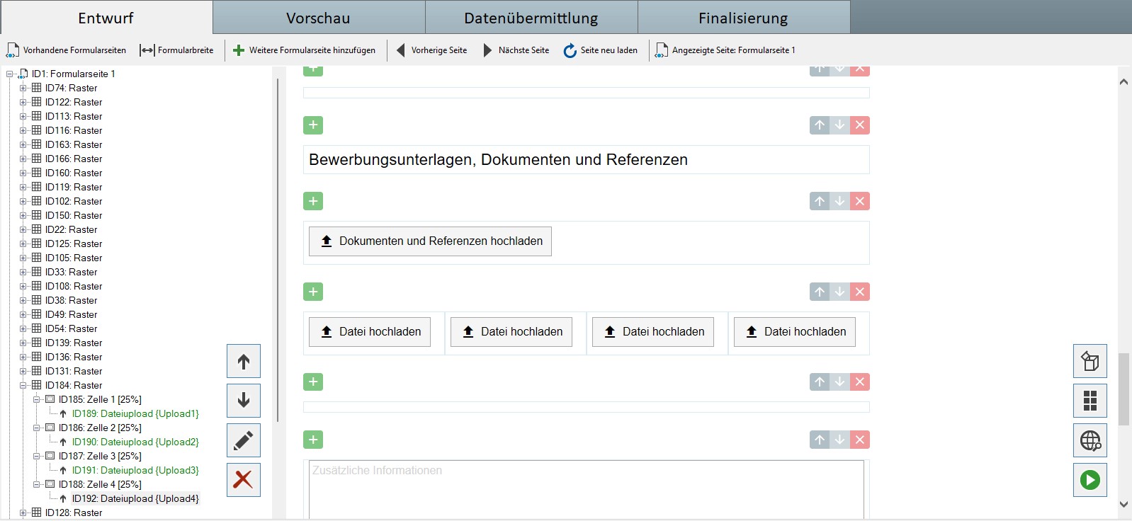 ... und dann jeder Spalte ein neues Upload-Feld zuordnen. Diesen Uploads kannst Du auch bestimmte Bedingungen geben, wie z.B. nur Bilder oder Bilder & Dokumente, usw.
