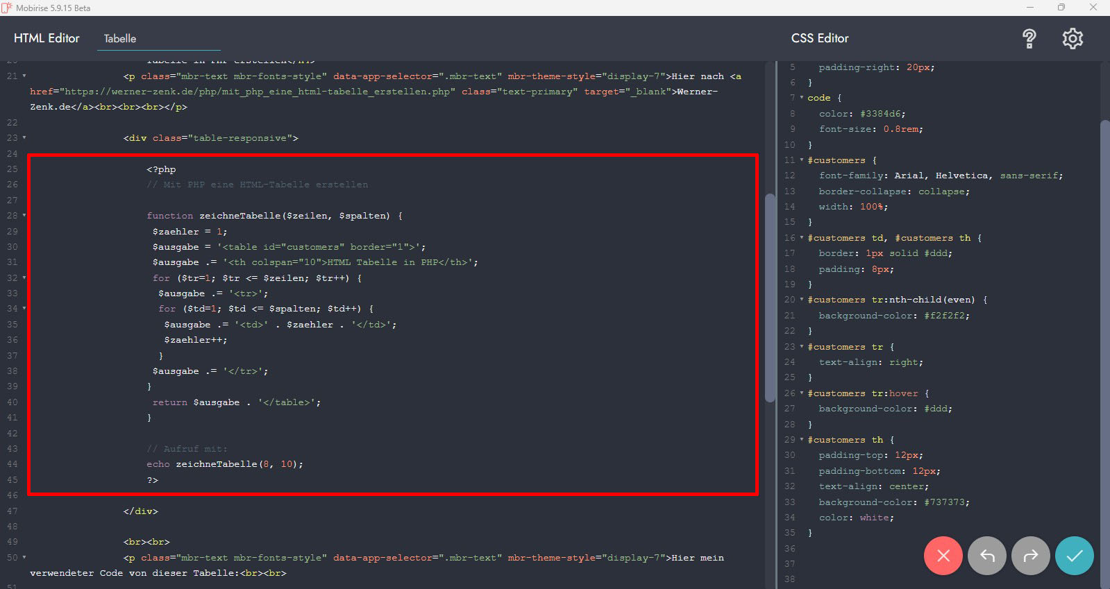 Nun habe ich diesen Code auf einer php-Seite in den Custum HTML Block von Mobirise5 gepackt, allerdings verändert Mobirise diesen Code immer automatisch bei der Stelle so, das zwischen <?php foreach($ergebnismenge as $zeile) : ?> und <?php endforeach; ?> nichts drinnen steht. Somit bekomme ich nur einen Tabellensatz angezeigt ☹. Hier nochmals, wie Mobirise automatisch den Code ändert: