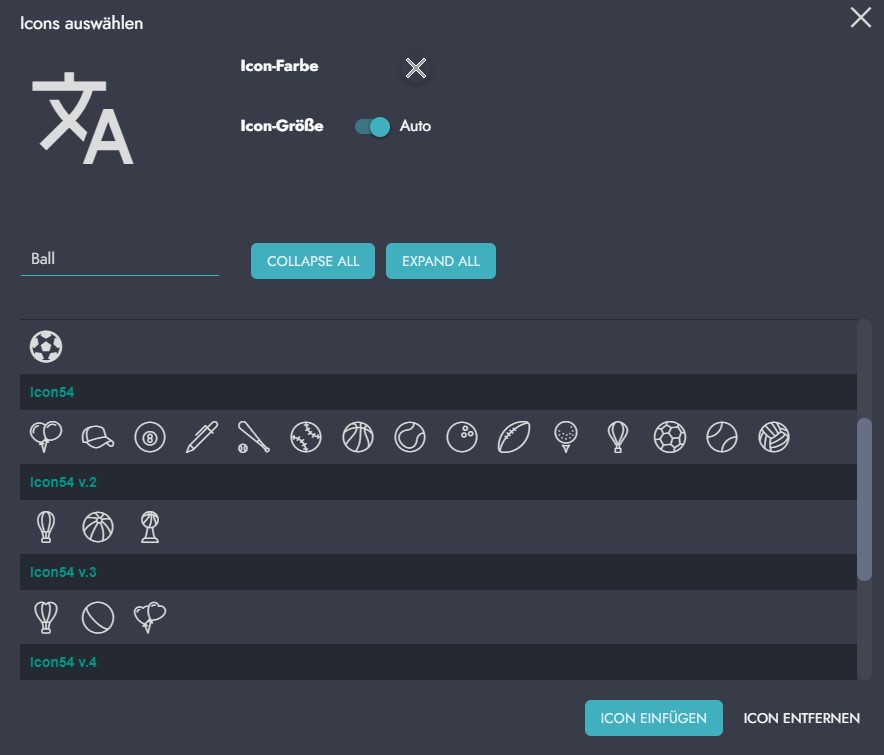 Dort kannst Du eines wählen oder auch suchen (suchen aber nur in englischer Sprache). Dann klickst Du unten auf den Button "Icon Einfügen":