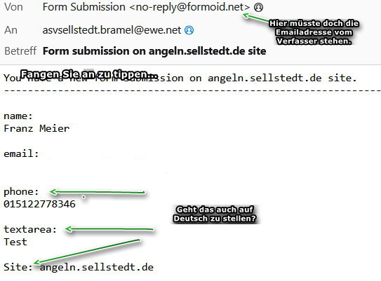 Den Inhalt dieser Mails kannst Du in keiner Weise beeinflussen, da diese direkt von "Formoid" kommen. Also auch deren Werbung nicht und ebenfalls die Sprache nicht. Die Antwort-Adresse kann man nur aus der Mail kopieren.