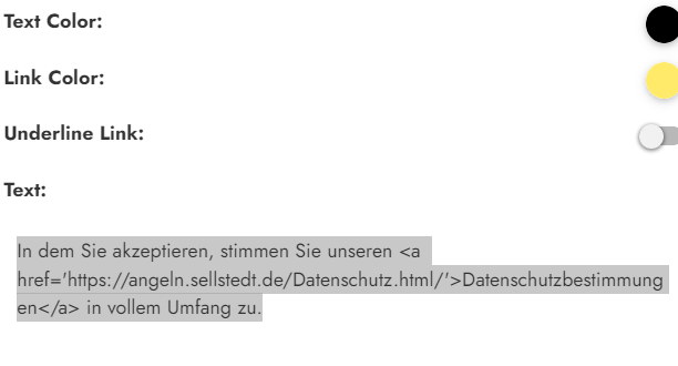 Trage dort direkt die URL, also die Adresse Deiner Datenschutzseite ein. Die Farbevom Text und Link kannst Du auch anpassen.