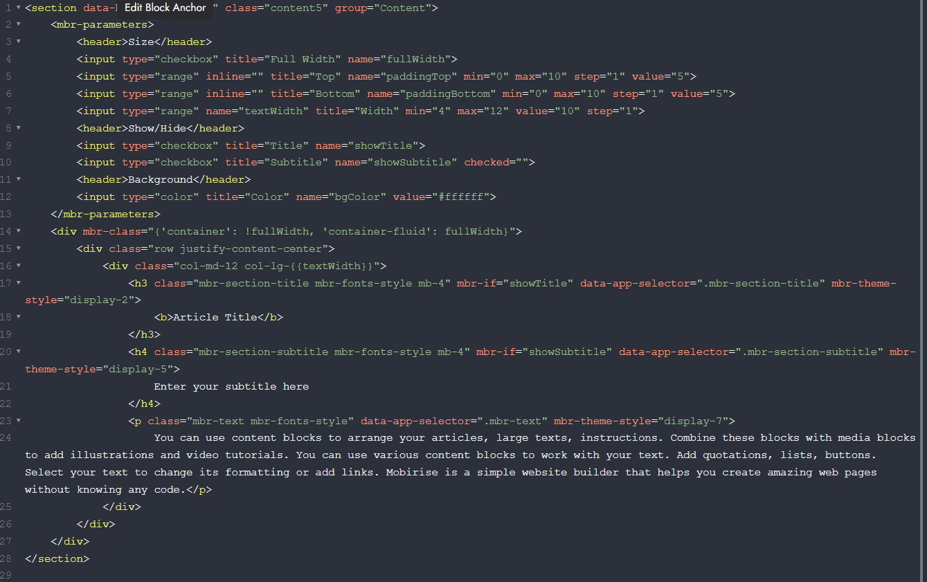 Ohne diesen "Code Editor" kannst Du fast nichts in Mobirise machen. Den braucht man ganz oft.