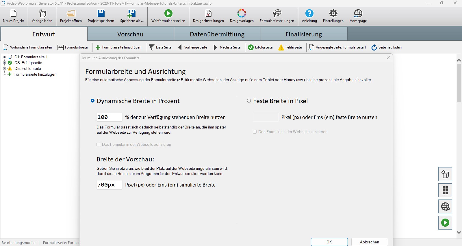 Wichtig ist auch, dass Du in der Arclab-Software bereits unter "Formularbreite" 100% dynamische Breite wählst: