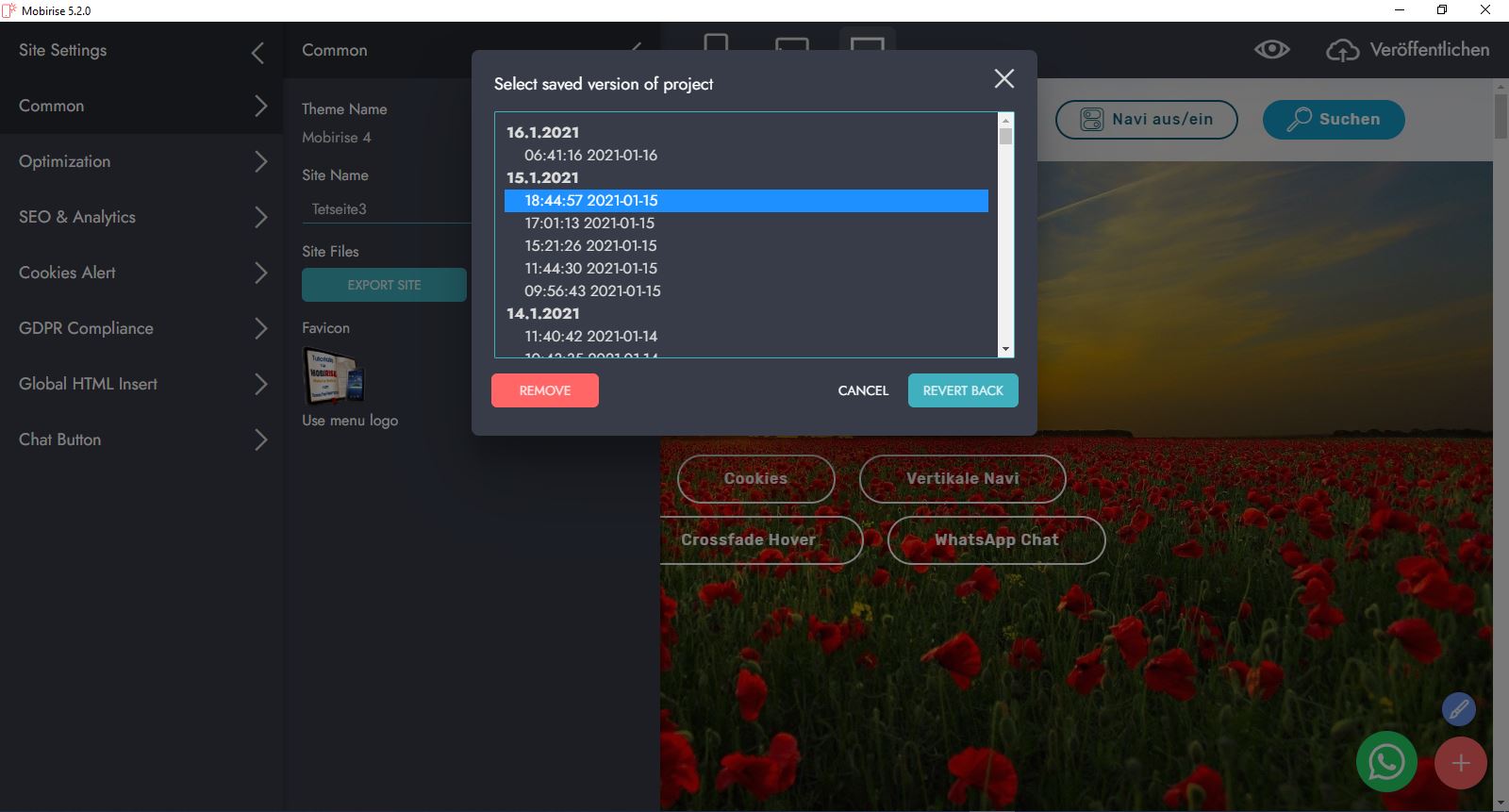 Wichtig zu wissen ist auch, dass eben jede Änderung von Mobirise im Verzeichnis "history" als Projekt-Datei gespeichert wird. Ihr könnt also bei Bedarf eine Version aussuchen, die dort nach Datum und Urzeit gespeichert ist, und wiederherstellen.