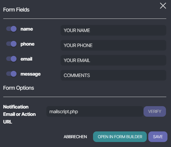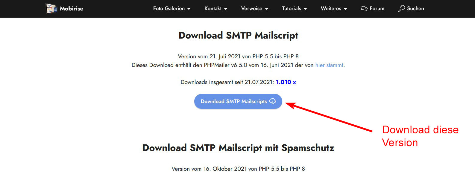 Alternativ kannst Du dieses Formular mit dem Formbuilder öffnen und bei Action URL das Mailscript eintragen, welches Du hier findest : https://www.mobirise-tutorials.com/Kontakt-Formular.php