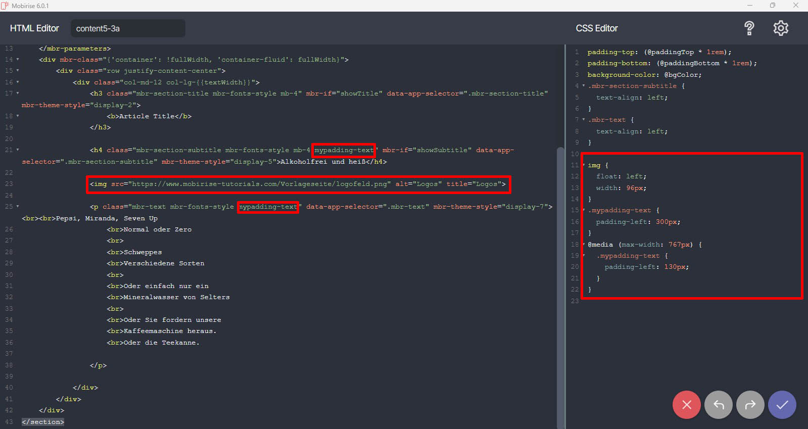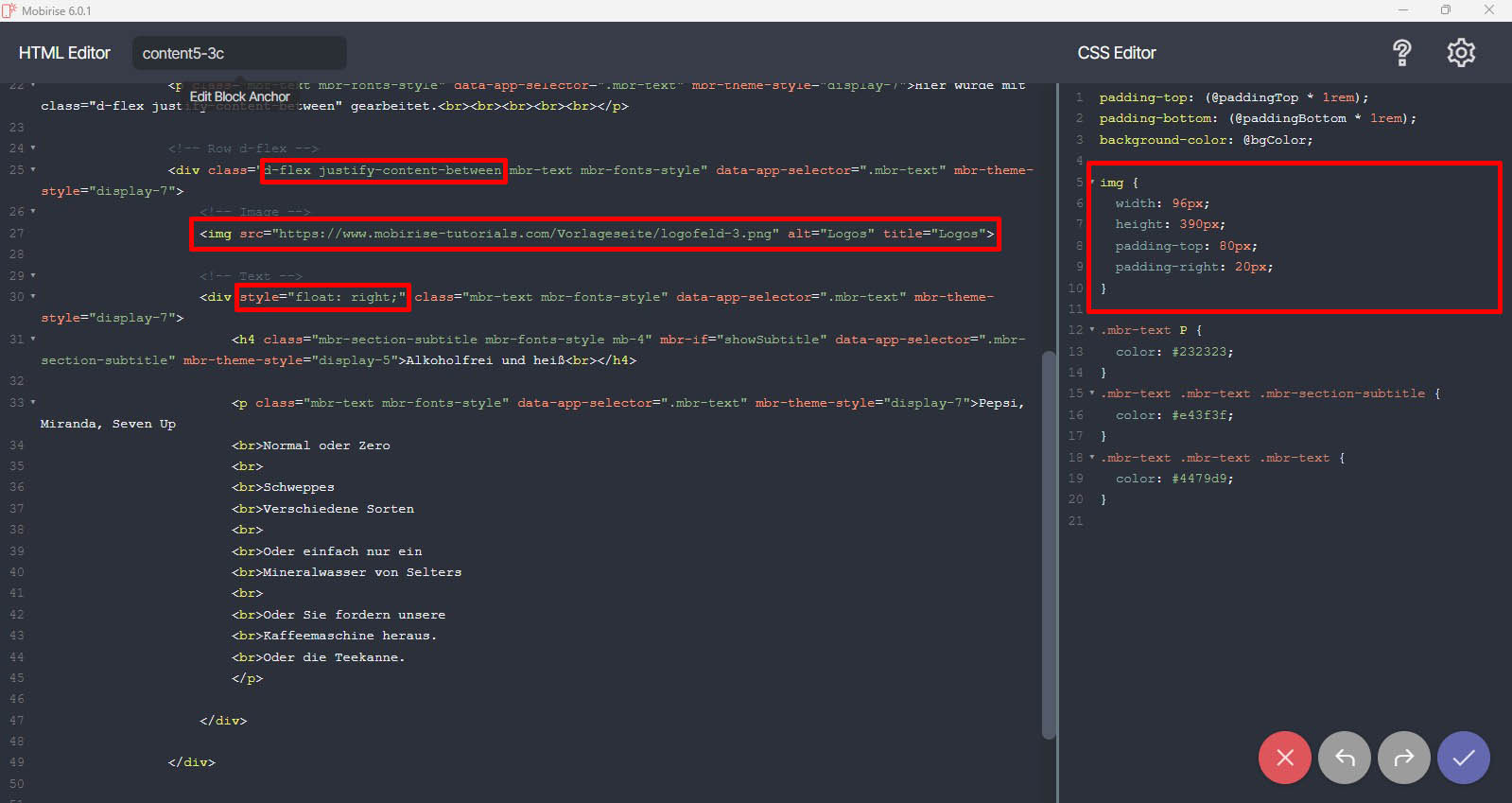 Dann braucht man etwas Abstand vom Bild zum Text, dieser Abstand rechnet nun aber nicht ab dem Bild, sondern ab dem linken Blockrand, hier im Beispiel 300px vom linken Blockrand. Diese class="mypadding-text" habe ich dann an das <h4> Tag der Überschrift und an <p> Tag vom Text mit hinzugeschrieben (rot markiert im Screenshot unten).