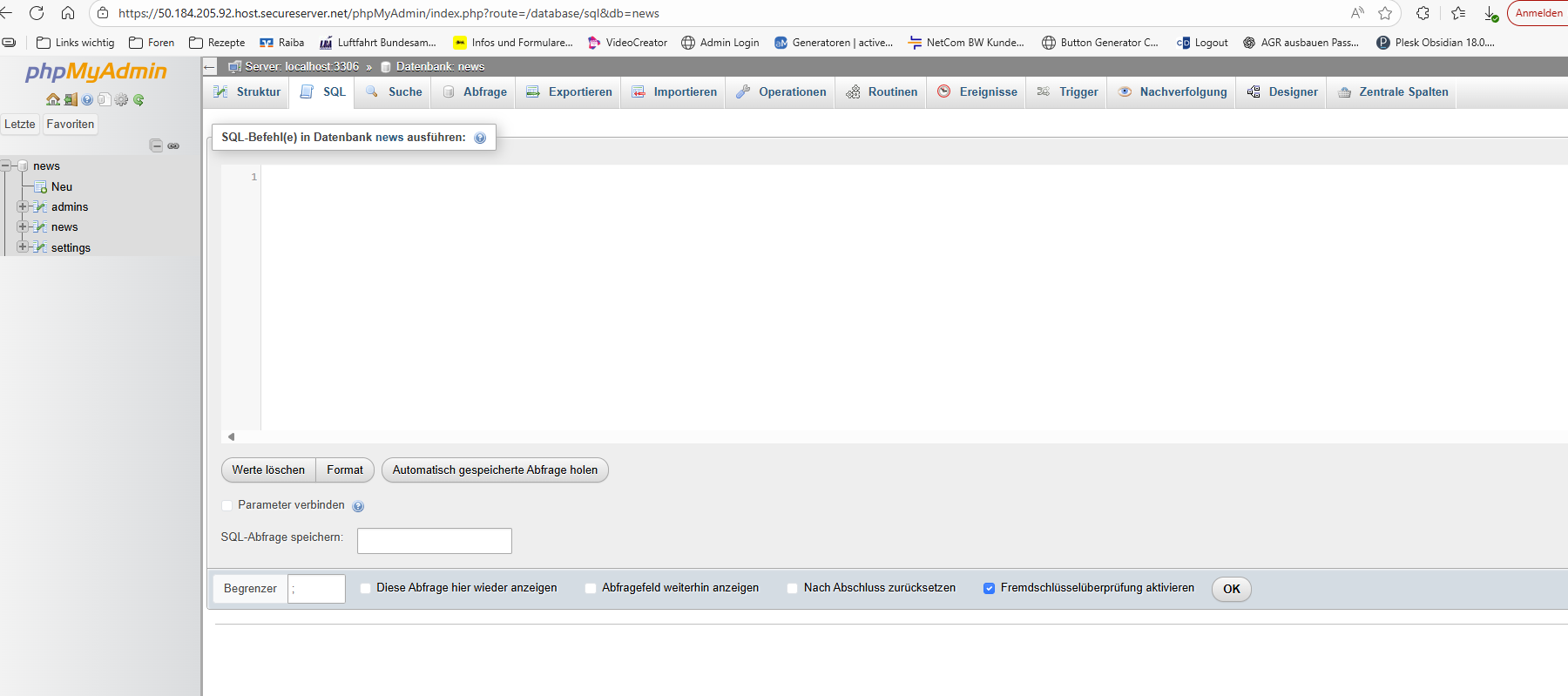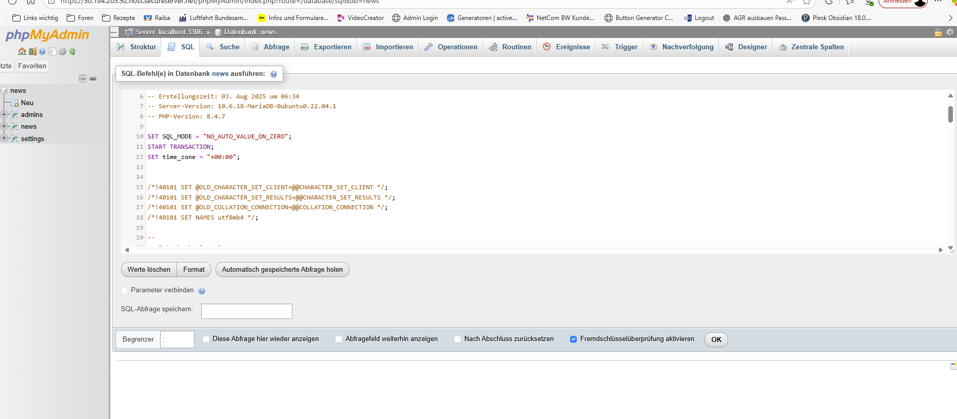 so mit einer "MariaDB" (Du schreibst MySQL) und Deiner neuen SQL Datei komme ich zumindest jetzt an die Datei news.php.