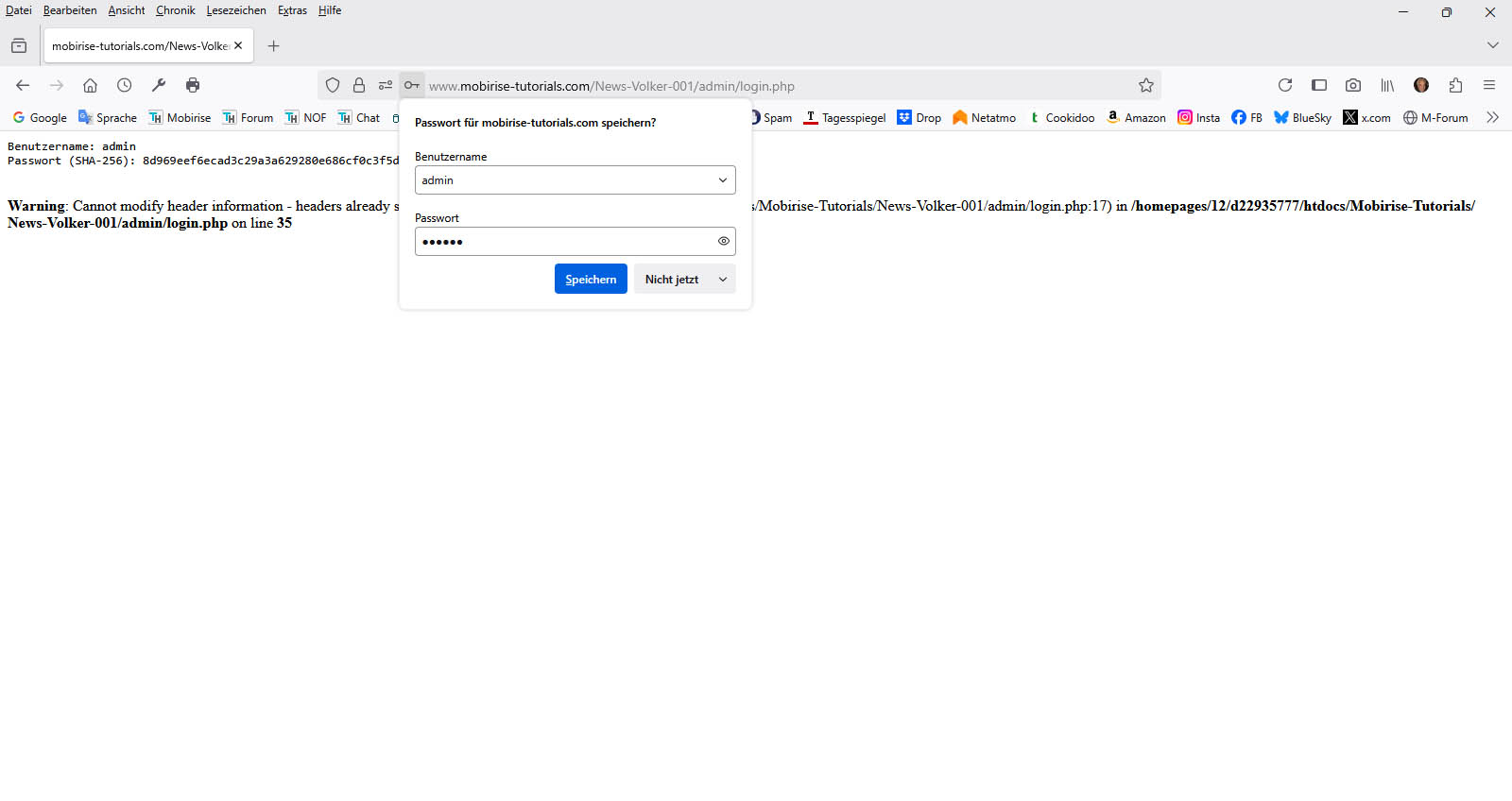 Rufe ich die Datei login.php oder auch irgendeine andere dieser Dateien im Verzeichnis "admin" auf, erhalte ich nach dem Login diese Fehlermeldung. Das stimmt noch etwas mit der Header-Location in Zeile 35 nicht: