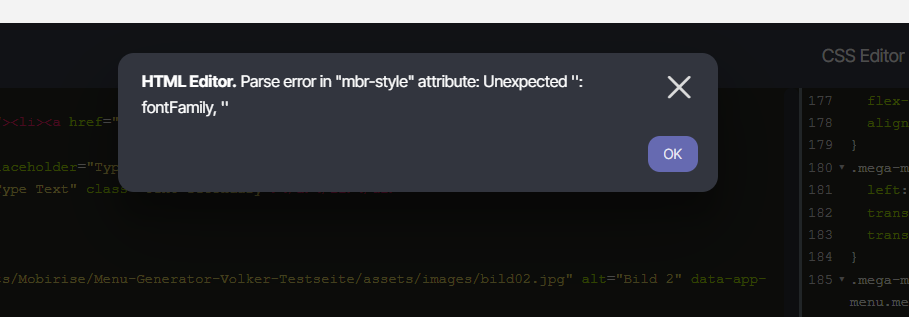 Bitte teste das im Standard-Thema "Mobirise5", denn ich vermute, dass Mobirise mit deinen Variablen die Du setzt die Menüleiste nicht in bereits vorhandene Seiten kopieren kann und es daher zum Absturz kommt.