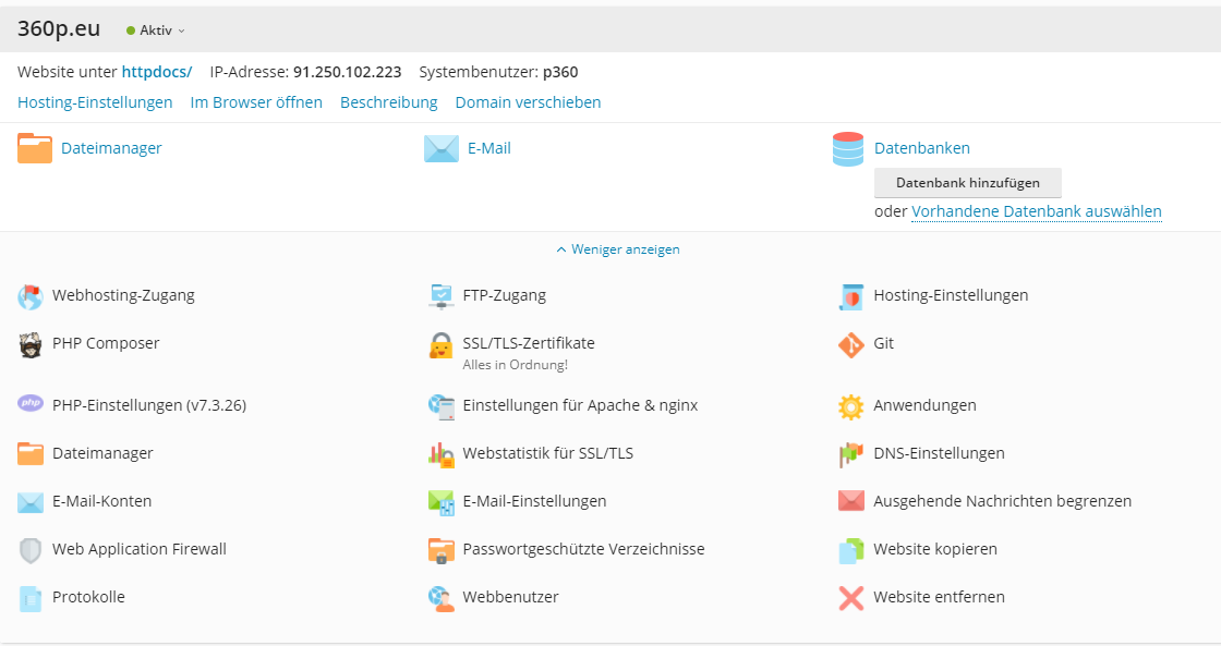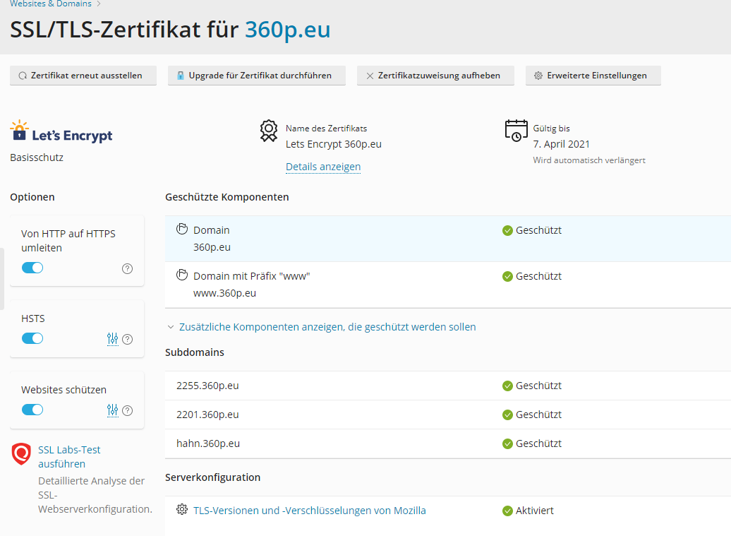Das war ein Kinderspiel und man gibt lediglich die zu verwendende Domain für das Zertifikat an. Alles andere wird von "1und1" vollkommen automatisch erledigt.