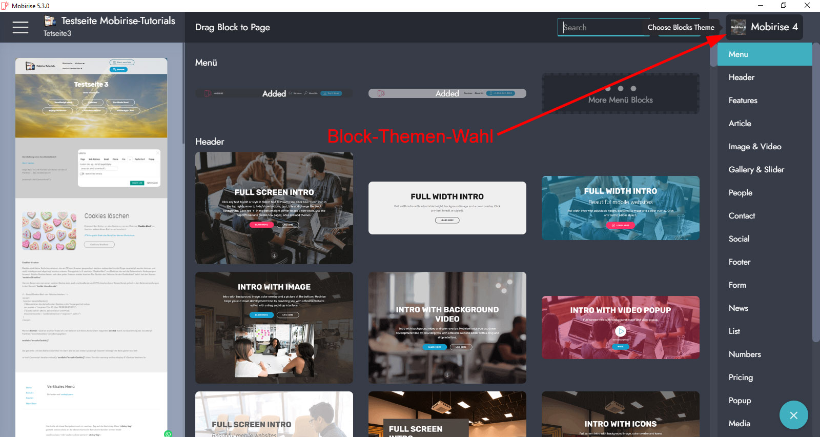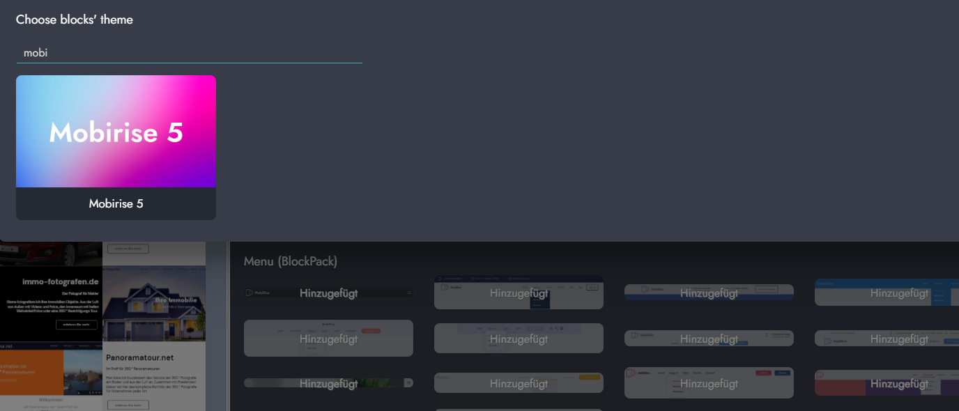 - in der Blockauswahl kann ich aber sowohl Mobirise4, wie auch Mobirise5 auswählen.