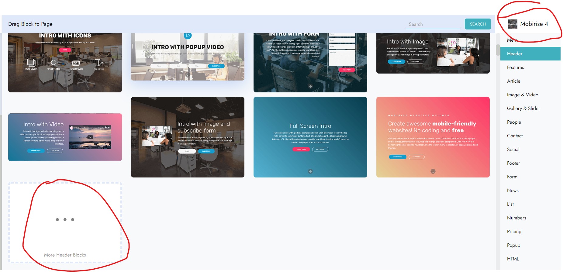 also wenn ich da in der Suchleiste "mobirise" (so wie Du) eintrage, dann kommen natürlich nur die Themen zur Auswahl, die so benannt sind: