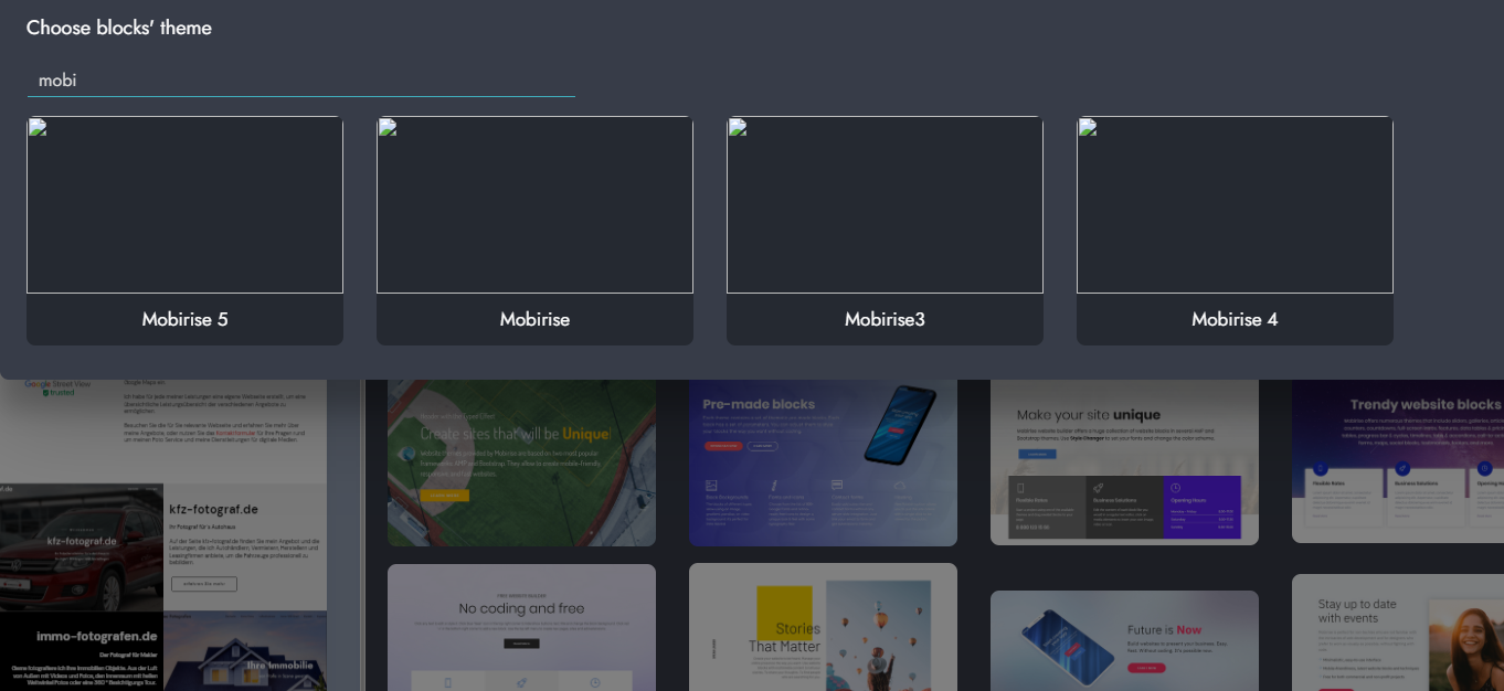 Du kannst dort also direkt, wenn Du z.B. das Standard-Thema "Mobirise4" für Dein Projekt in Arbeit hast, Blöcke aus irgendeinem anderen Bootstrap-Thema öffnen und direkt verwenden. Du musst also nicht mehr den Umweg über gespeicherte "User-Blocks" nehmen.