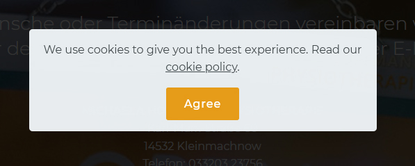 Ich möchte, dass wenn man auf den Link "cookie policy" auf eine eigene Seite Datenschutz kommt (das ist kein Problem, die kann man schön im Hintergrund scrollen, bis der Finger wund ist), aber wenn dann diese "Seite Datenschutz" offen ist, dann soll durch Betätigen des Buttons Agree sich die Startseite öffnen, da ich ja bestätigt habe. Es bleibt jetzt die Datenschutzseite offen :confused: Im Prinzip Button Agree verlinken mit Startseite und los geht´s (kriege ich nicht hin als Laie) Gruß Ulli