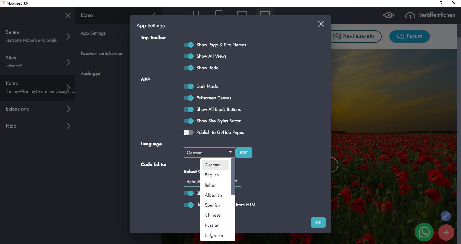 Am Rande: Mobirise kann man auch auf Deutsch einstellen.