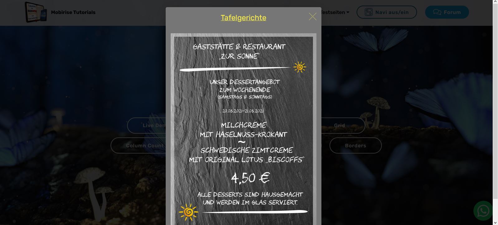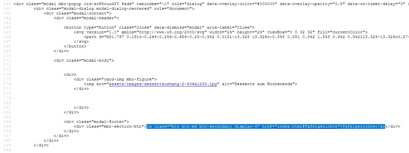 Vielleicht solltest Du lieber einen Link zu den "Tafelgerichten" setzen und den Button weglassen und auch die Höhe vom Popup reduzieren, denn auch am Handy ist der Button unten schon nur noch zur Hälfte sichtbar und wirkt zusammenhanglos.