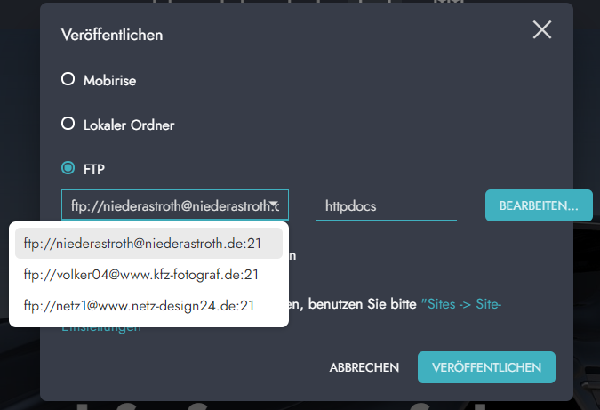Leider kann man aber immer nur ein Verzeichnis pro Server, im Feld rechts neben der Server-Adresse, eintragen, das man bei Bedarf dann immer wieder anpassen muss. Das habe ich seit Jahren, gefühlte Hundert Mal gemeldet, es scheint aber bei Mobirise niemanden zu interessieren.