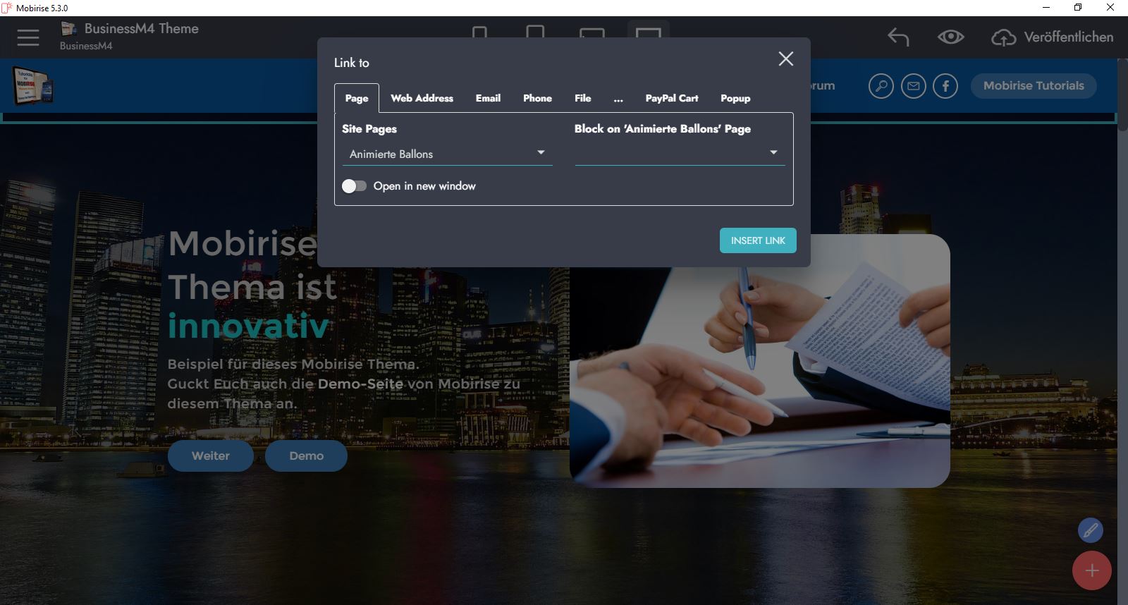 Was meinst Du denn mit "nur direkt aufrufen"? Du musst natürlich vor der Veröffentlichung auch Deine Navi im "Link-Fenster" von Mobirise bearbeiten und die Seiten als Links dort wählen. Das macht Mobirise nicht alleine (wie es bei der Auto-Navi von NOF der Fall war). Du kannst dort interne Links ("Page") und auch Sprunganker zu bestimmten Blöcken oder auch externe Links ("Web Address") auswählen: