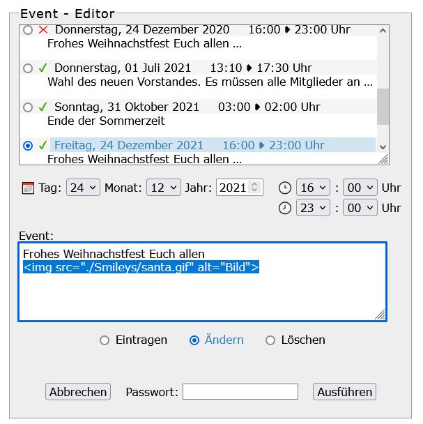 Editor eintragen, ändern und löschen. Abgelaufene Termine werden automatisch nicht mehr angezeigt. Das alles direkt online.