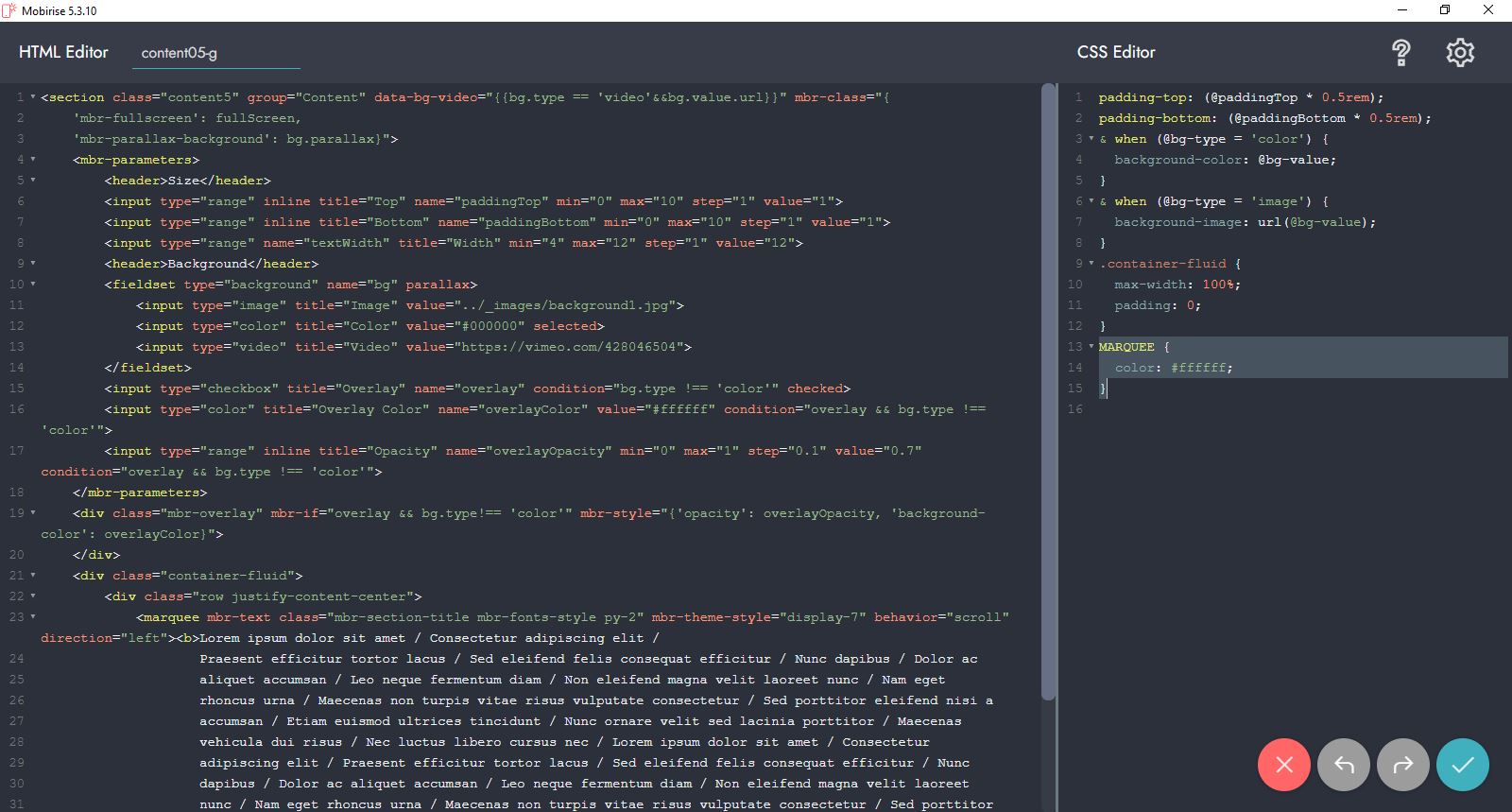 Es ist von Mobirise nicht vorgesehen das <marquee> Tag über die Werkzeuge-Leiste farblich zu ändern.