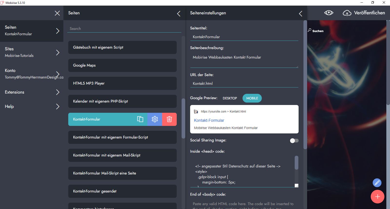 Denke daran, den Seiten unter den "Seiteneinstellungen" (am "Zahnrad-Werkzeug") vernünftige Dateinamen zu geben (keine Umlaute, keine Leer- oder Sonderzeichen), also nicht "page4.html" oder so, sondern dann z.B. "kontakt.html". Auch eine gute, kurze und jeweils seitenbezogene Seitenbeschreibung und ein aussagekräftiger Seitentitel ist später für die Suchmaschinen (SEO = Suchmaschinenoptimierung) sehr wichtig.