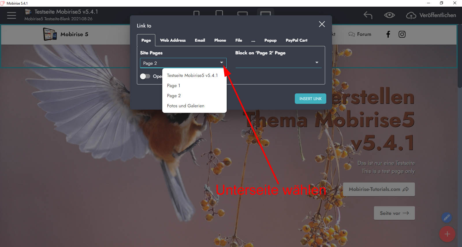 Site Pages", rechts daneben kann man auch noch einen bestimmten Anker von einem bestimmten Block ansteuern: