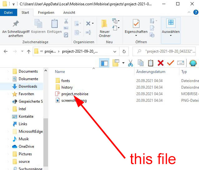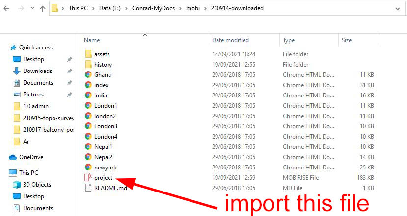 First of all - why did you not try to import the file "project.mobirise" directly from your downloaded directory. The last modified date is September 19, 2021 - yesterday: