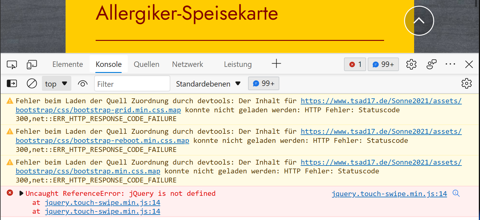 Was mir mehr Sorgen machen würde, sind die vielen Fehlermeldungen in der Browser-Konsole: