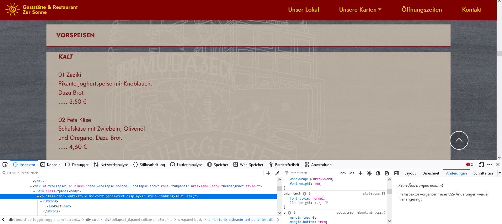 Die Gerichte auf den Speisekarten stehen zu weit links.
