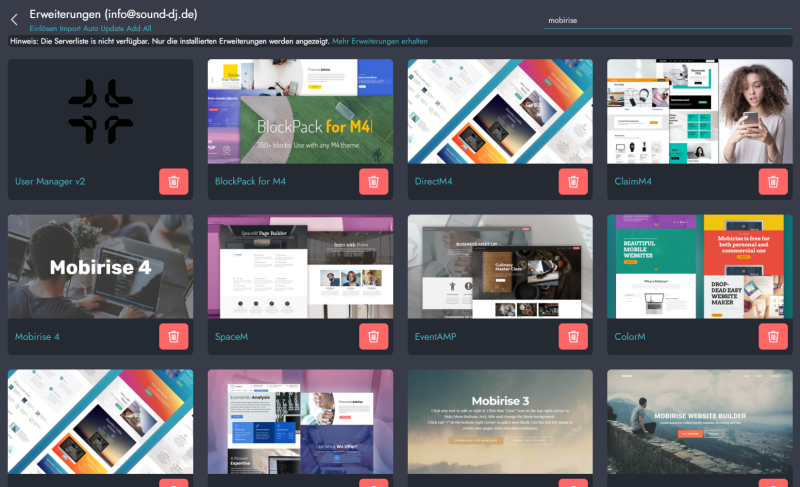 Wie Du im Screenshot oben erkennen kannst, sind dort auch die Themen "Mobirise3" und "Mobirise4" als Erweiterungen installiert, da ich bereits "Mobirise5" verwende. Die alten "M" Themen (wie z.B. "ColorM") findest Du auch bei mir nicht, da ich diese damals nie verwendet hatte, sondern anfangs immer nur das Standard-Thema "Mobirise3".