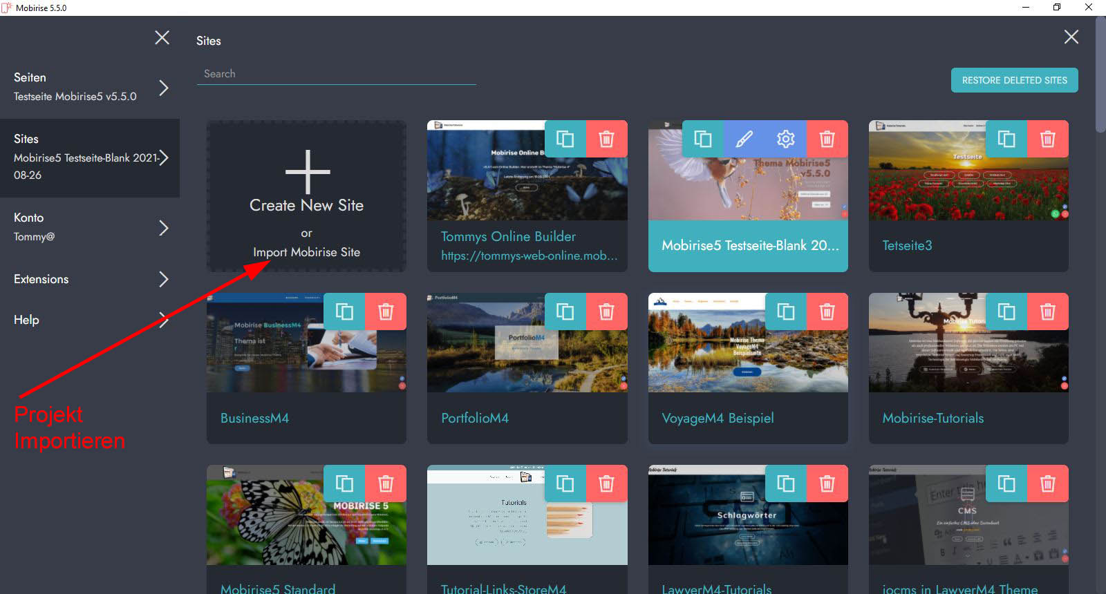 Jetzt erscheint das so importierte Projekt wieder in der Übersicht der Ansicht "Sites".