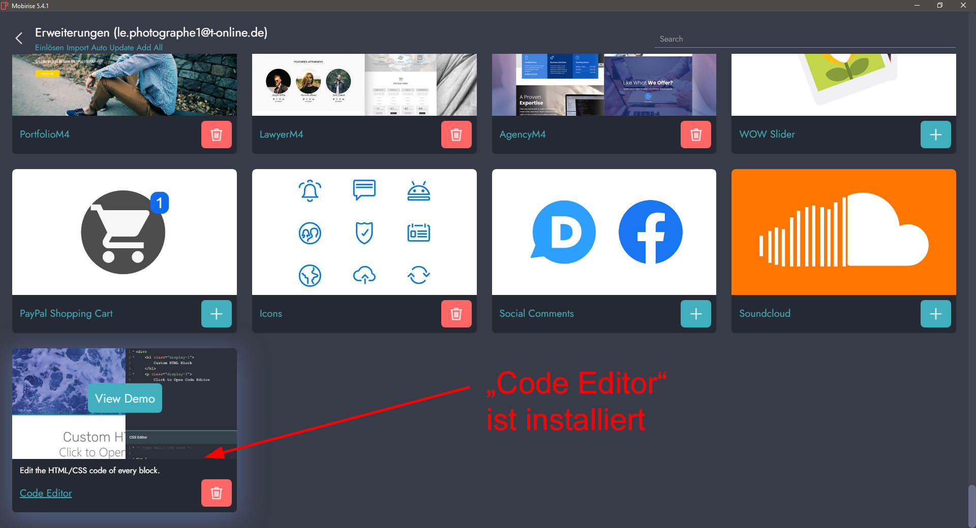 ... Du hast den "Code Editor" bereits installiert. Das tut man am grünen Plus "+" zeichen. Deinstallieren kann man Extensions am roten Papierkorb und auch anschließend jederzeit wieder installieren (innerhalb seiner Lizenz).