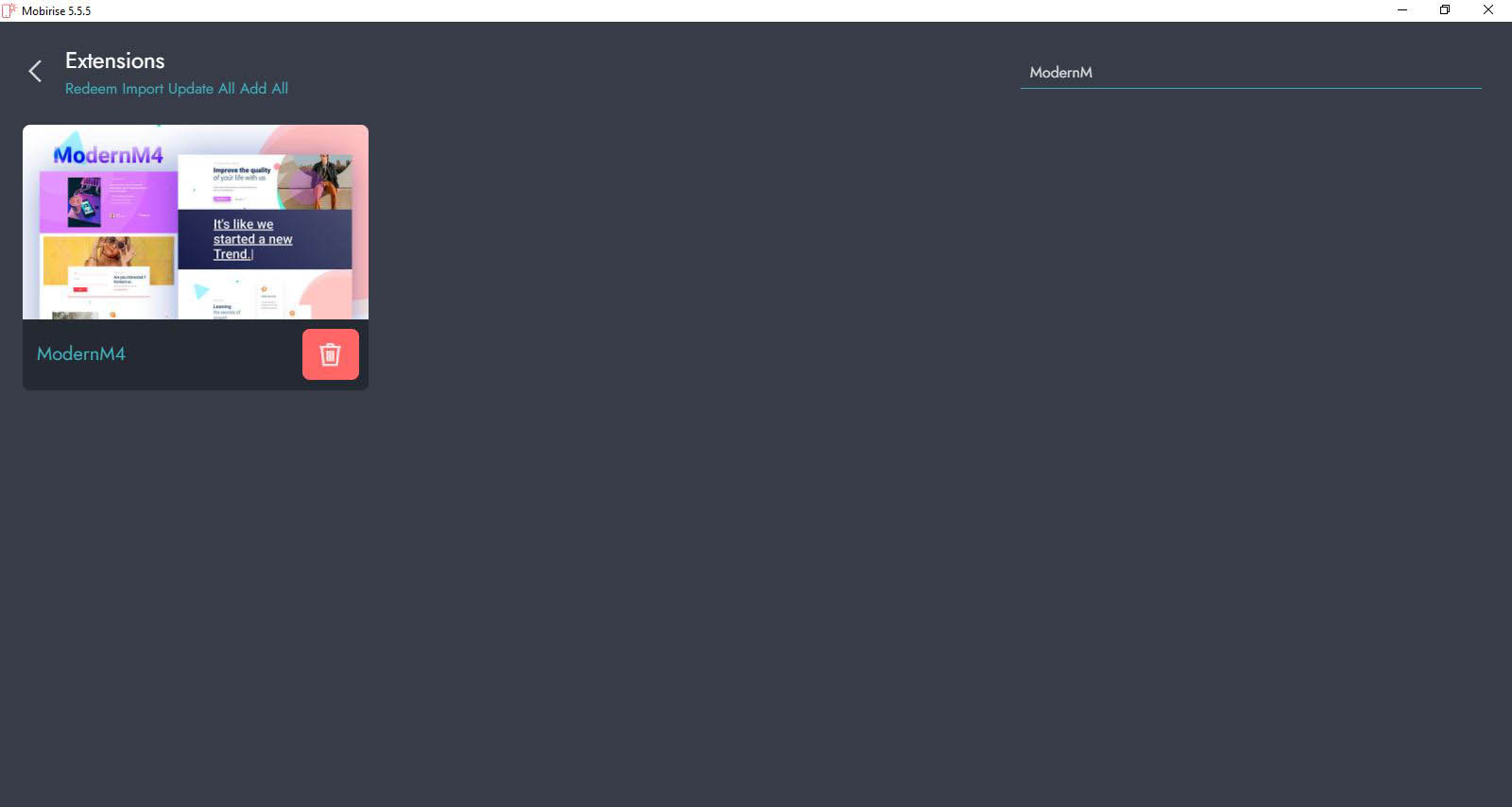 Das zuvor erstellte Projekt war noch da und das Thema "ModernM4 unter Extensions ist vorhanden.