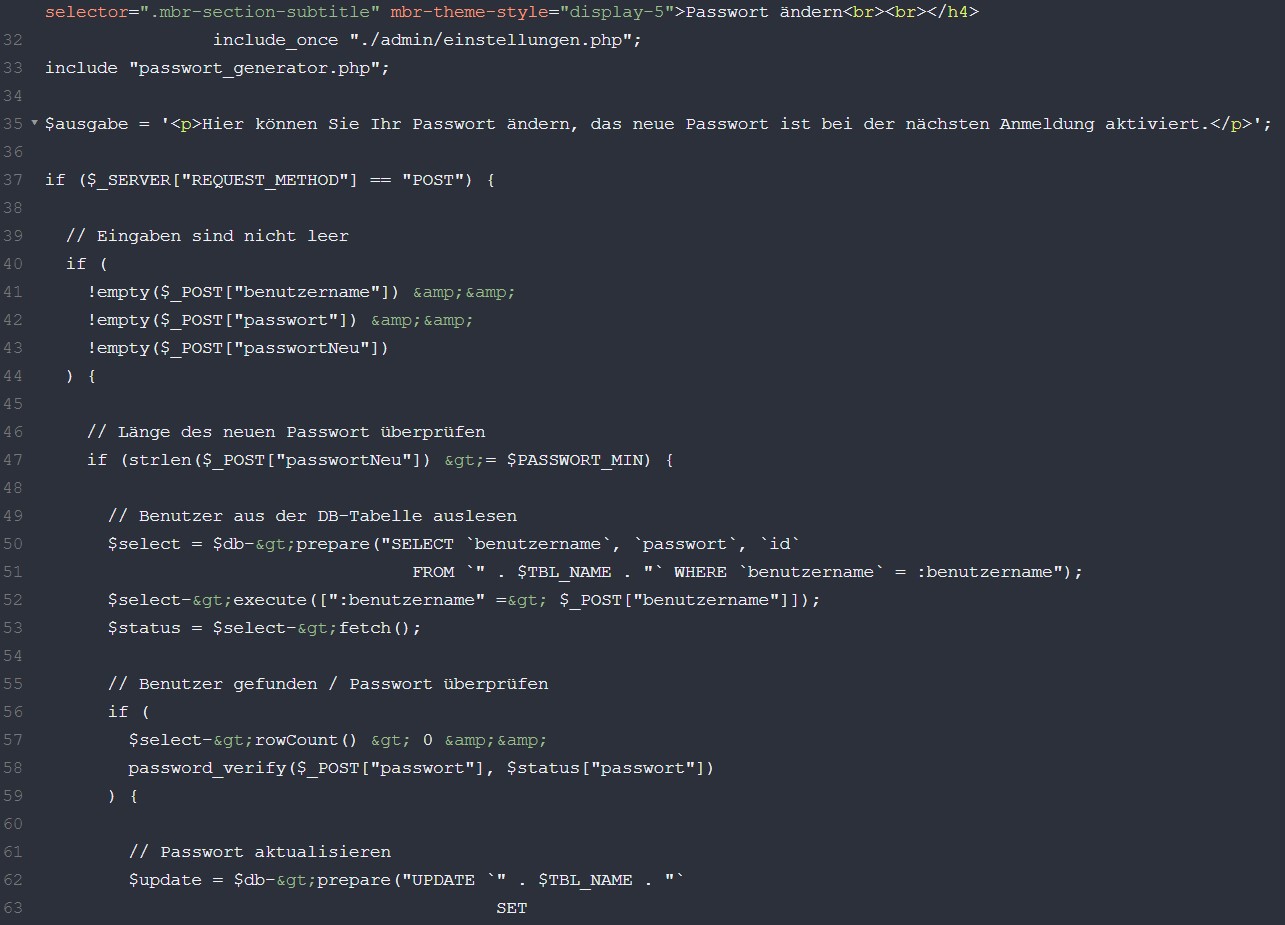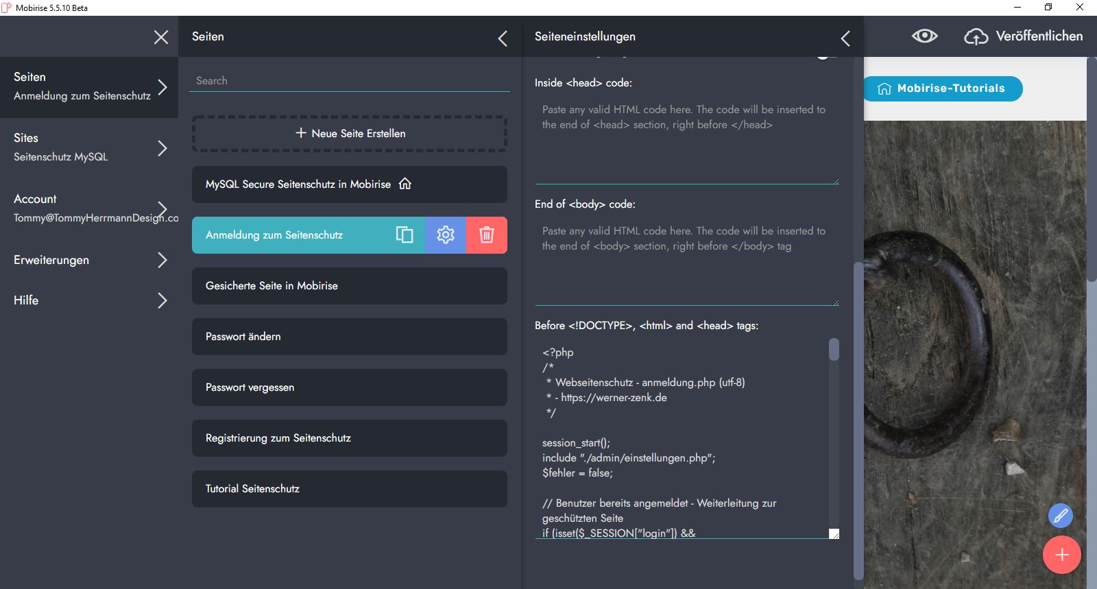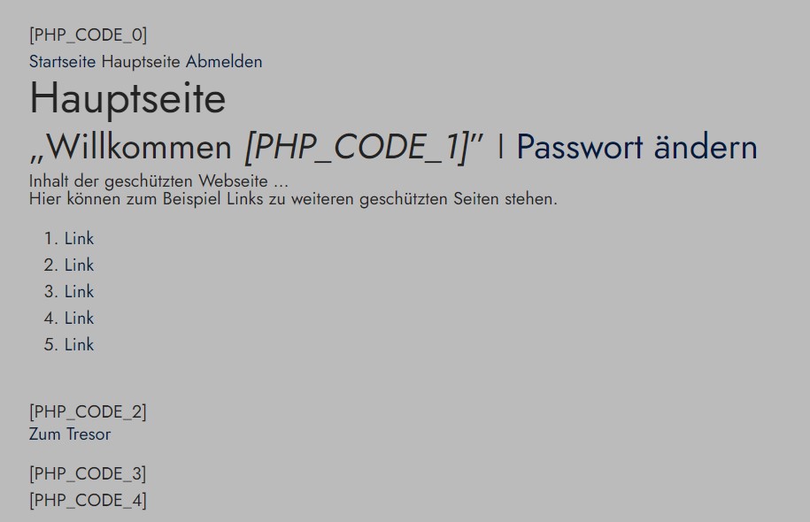 Wie du auch oben im PHP-Code erkennen kannst, wird bei erfolgreicher Anmeldung auf die Seite "hauptseite.php" weitergelietet. Die Seite "hauptseite.php" liegt beim Werner nicht in der Root, das habe ich für Mobirise extra geändert, da ja Mobirise immer nur in die Root publizieren kann und nicht in Unterverzeihnisse. Da müssen wir später noch genauer darauf eingehen.